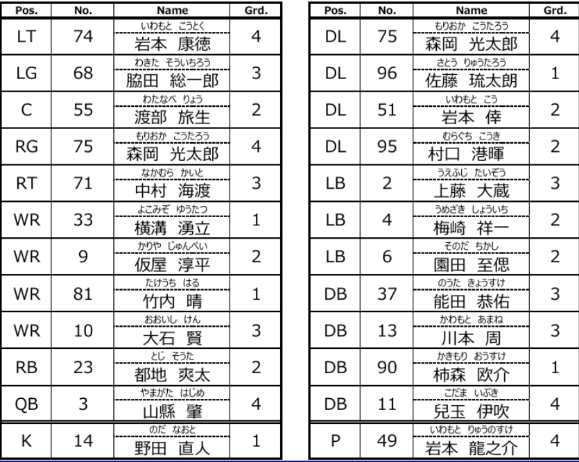 全日本選手権第一回戦 九州大学 30 – 0 山口大学 2025.11.08 広島広域公園第二球技場 記録・集計:広島大学 作成:上田愛 TEAM1Q2Q3Q4QTOTALPALOOKAS7014728GAMBLERS0140014 スターター チームスタッツ 九大 山口232総獲得ヤード2294タッチダウン24/4PAT (1点) 成功/回数2/20/0PAT (2点) 成功/回数0/00フィールドゴール091stダウン更新回数12146ラン獲得ヤード8720回数267.3平均3.386パス獲得ヤード14210/19成功/試投17/301被インターセプト24QBサック01/1ファンブル回/ロスト1/010/1罰退/反則回数31/5 個人記録 ※個人記録の合計がチーム記録と一致しないことがあります Rushing No.NAMEyard回数最長ydsTD10大石賢-21-2028都地爽太83757235岩崎将幸21310131長友 脩真468160 Receiving No.NAMEyard回数最長TD10大石 賢1641509仮屋淳平82600小林尚矢527011兒玉伊吹572441 Passing No.NAMEyard成功/試投TD3山縣 肇849/16115田部井希拓21/30 QB Sack No.NAME回数ヤード2上藤大蔵194梅崎祥一21075森岡光太郎16 Intercept No.NAME回数ヤードTD11兒玉伊吹10013川本周1180 Kick Return No.NAME回数ヤードTD35都地爽太19049岩本龍之介100 Punt Return No.NAME回数yardTD23都地爽太231035岩崎将幸2460 Fumble Return No.NAME回数yardTD 得点経過 QTEAMplayyardplayerTFPscore1九大run5#23 都地kick〇7-01山口pass26#10 木下→#7 小山kick〇7-72山口int22#10 木下kick〇7-142九大pass13#3 山縣→#11 兒玉kick〇14-143九大run57#23 都地kick〇21-144九大run5#35 岩崎kick〇28-14